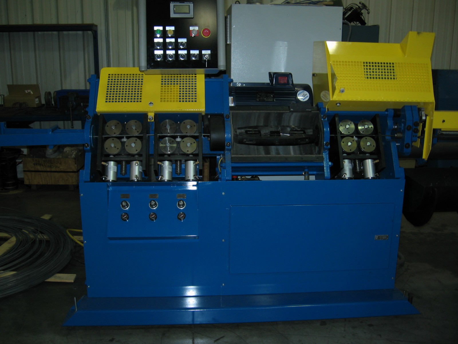 刘易斯机器SV16:这些型号可以处理较厚的电线,同时仍然提供快速而精确的拉直和切割。它们具有独立的控制,以调节进纸卷压力和速度。The wire diameter range capacity is between .050” and .315” (1.3mm to 8.0mm), variable feed speed is 0 to 400 fpm, wire line height is 43.5”, and when equipped with a 3’ extension they require 120” X 51” of floor space.