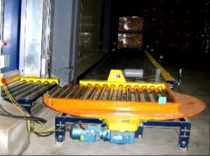 Norpak处理设计出由双链驱动滚动传送器和转盘系统构成的进/出系统内向系统传递托盘通过自动门进入冷冻器区转盘旋转90度并卸载托盘移送器等待产品存储外向系统允许托盘装入传送器信号灯加载显示有负载并准备清除叉车司机知道打开门并卸载负载