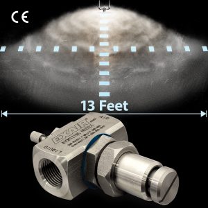EXAIR’s internal mix 360-degree hollow circular pattern atomizing spray nozzle is perfect for tasks that require a liquid application in a broad area and a smooth, even coating, including dust suppression, cooling, and humidification, as well as coating the insides of pipes or ducts with large diameters. It is recommended for any pressure-fed applications that do not need independent air and liquid control. The nozzle is designed to spray for a diameter of up to 13 feet, in a 360-degree range of directions, orienting the spray pattern away from itself.