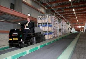 为了将拍卖的鲜花运送到冷藏车上,电动拖曳车被用来拉动多达30辆装满鲜花的手推车。这些货物加起来可达12吨。由于手推车在陡峭倾斜的装载坡道上移动,负载太重,拖曳车辆无法处理制动。