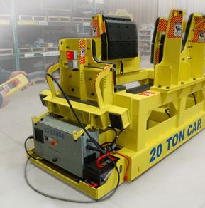 The solution:A forklift was considered, but it was quickly discarded as a solution due to physical size of the forklift in a capacity to suit the die. Ultimately, the company selected a Mentor steerable battery-powered transfer cart with custom deck fixture. The cart has a 20-ton capacity and flip-out panels that are used to accommodate the two die halves. It features pads lining the fixture and flip-out panels to prevent damage to the die from metal on metal contact, as well as dry cell batteries that provide hours of drive time and require no maintenance. An on-board charger plugs conveniently into a 120-volt wall outlet for battery recharging. Another feature: a hand-held pendant controller provides motion control moving forward, backward, left or right. Safety features include warning alarms (audible and flashing light) that alert workers in the area of cart operation. A quick disconnect plug conveniently allows pendant cable change-out without the need for an electrician. The pendant cable has a strain relief to prevent damage from excessive tension.
